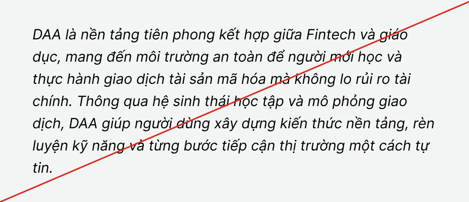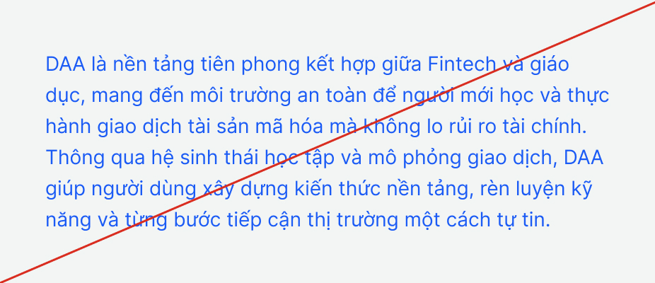 Các hướng dẫn được thiết kế để đảm bảo mọi hoạt động thiết kế và truyền thông của DAA luôn phản ánh đúng giá trị cốt lõi: an toàn, minh bạch và trao quyền học tập cho người dùng trong lĩnh vực tài sản số.
